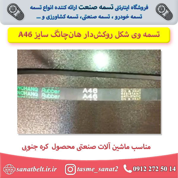 تسمه V شکل روکشدار هانچانگ عرض ۱۳ میل و گوشت ۸ میل سایز A46 مناسب ماشین آلات صنعتی و کشاورزی با فولی ساده